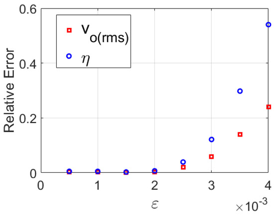 Figure 7 shows the relative error between theoretical predictions obtained using the Gaussian moment closure method and numerical simulations changing the noise intensity, for both the root mean square output voltage (red squares) and the power efficiency (blue circles). The relative error is evaluated as