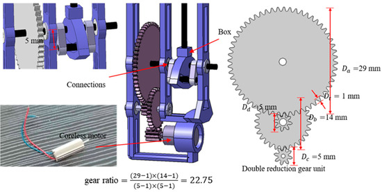 As depicted before, although the rotational speed of the coreless motor is as high as 30,000 rpm, the output torque is only about 4.78 mN·m. Thus, in order to provide enough thrust to push the pushrod, three gears are used to form the double-reduction gear unit as shown in Figure 2, wherein the addendum circle diameter of these three gears are = 29 mm, = 14 mm, and = = 5 mm respectively. The depth of the teeth () is 1 mm. By assembling these gears properly, a double-reduction gear unit is designed with its gear ratio equal to 22.75:1. Moreover, the distance between the two holes on the connections is 5 mm which limits the feathering amplitude of the pushrod to ±5 mm.