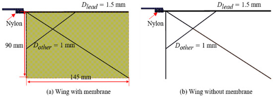 The wing assembly composed of stop blocks, angle limiter, leading-edge beam, subsidiary beams, and wing membrane is shown in Figure 3a, wherein both the stop blocks and angle limiter are made from nylon plastic. The leading-edge beam is made from 1.5 mm carbon/epoxy rod (0.5 g) while the other subsidiary beams are made from 1 mm carbon/epoxy rod (0.4 g). Moreover, the weight of the wing membrane is 0.4 g. The length of the spanwise beam and chordwise beam is 145 mm and 90 mm, respectively. In fact, with the wing membrane, the force obtained by the load cell should be the total force composed of inertial forces and aerodynamic forces [16]. In order to strip out the inertial component from the total forces, it is necessary to test the inertial component by testing the vertical forces generated by the FWR’s model without the wing membrane [21,22]. To remove the inertial component from the total forces tested based on the original wing assembly model in Figure 3a, an additional inertial model is manufactured by removing the wing membrane as given in Figure 3b. The shape of the wing planform is not bio-inspired in this study.
