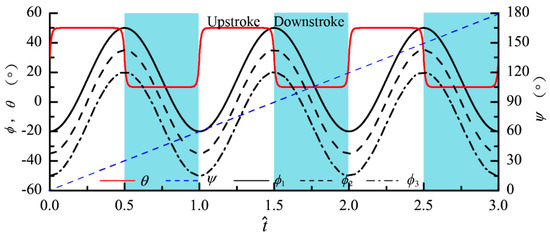 Since the crank-slider mechanism is used to drive the flapping-wing rotor, the stroke angle curves nearly follow a sinusoidal function (−20°–50°, −35°–35°, or −50°–20°) as shown in Figure 4. The angle limiter and stop blocks can make the FWR generate passive twisting angle () varying from 10° (during the downstroke) to 50° (during the upstroke). The average twisting angle is chosen to be 30° since it is the optimum angle to achieve high lift for the rectangle wing [25]. It is noted that the phase difference between the stroke angle and twisting angle is nearly 90° as found in the previous studies [23,24,25]. The slope of the rotary angle () curve is assumed to be a constant value and obtained by experiment. It is noted that the Figure 4 just shows the rigid kinematics defined by the FWR structure and the time it takes to change the twisting angle from 50° into 10° is assumed to be 0.1 flapping period.