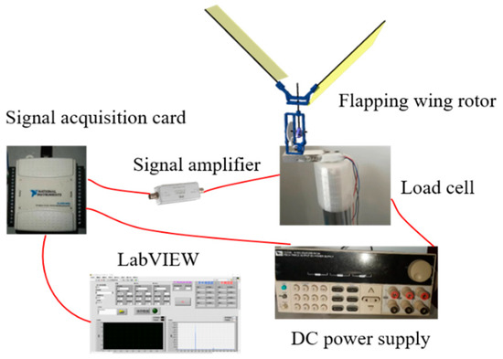 As shown in Figure 5, in order to realize the lift measurement, it is feasible to use a load cell (SEEED STUDIO 314990000) and a signal acquisition card (NI USB-6008). The 2nd-order low-pass Chebyshev algorithm in the LabVIEW code is employed to filter the measured voltage signals [26,27]. The electrical power consumption is obtained by multiplying the average current displayed on the power supply with the input voltage. The detailed introduction for the setup of the lift measurement system and the accuracy of the lift measurement system were discussed in our previous study [25].