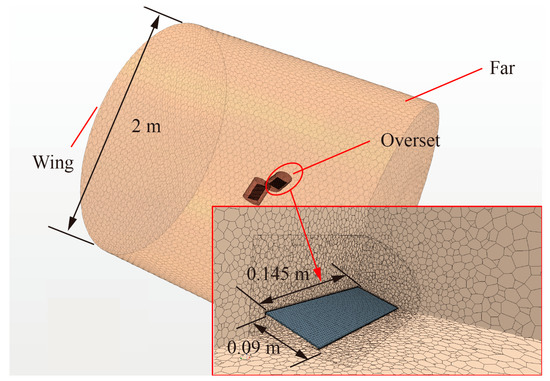 In this manuscript, a comparison between the numerical and experimental results is performed. The CFD solver used is StarCCM+ 2020 and the mesh is also plotted by StarCCM+ software as given in Figure 6. The lift calculation in this study is fulfilled by solving the unsteady Reynolds average equation built in StarCCM+ software. To ensure the numerical stability of the calculation, implicit Euler time discretisation method is applied. It is noted that the deformation of these wings is not included in this model. The height of the first mesh cell off the wall is set as 0.1 mm, and 10-layer boundary layer mesh is plotted. The total number of the meshes is about 2 million, and polyhedral meshes are used in the CFD calculation. The whole fluid field can be mainly partitioned into two regions: the background mesh region and the overset mesh region. A user-defined function is programmed in Python language to make the overset mesh region fulfill the rotation motions of the wings. Moreover, the SST turbulence model is applied as that used in previous study [28].