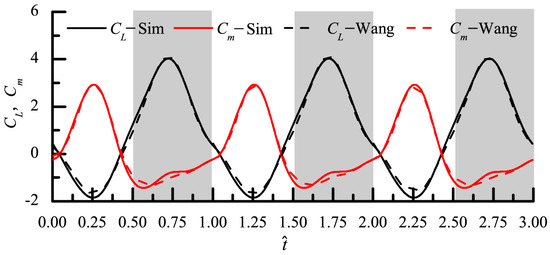 For validating the CFD model in this paper, the lift and moment results by our CFD simulation are compared with those obtained by Wang et al. [24]. The variation function of twisting angle (), stroke angle (), and rotary angle () are set the same as those in the literature. According to Figure 7, it is observed that, by using our CFD model, the equals to 0.88, and equals to 0.145, which is quite close to those given by Wang et al. (= 0.92 and = 0.13). The difference should partly lie in the different mesh type and solver used. Generally, the above comparison illustrates that the CFD model in this paper is appropriate for the aerodynamic calculation of the FWR.