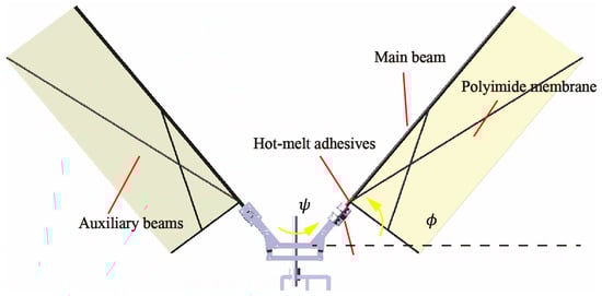 To facilitate the understanding of the inertial force results tested by the experiment, an ADAMS model is also built up as shown in Figure 8. As depicted in Table 1 and Figure 3, the single wing assembly weighs 1.7 g and can be further decomposed into several parts, including the hot-melt adhesives (0.2 g), nylon stop blocks & angle limiter (0.2 g), main beam (0.5 g), wing membrane (0.4 g), and subsidiary beam (0.4 g). To keep consistency with the experiment, the wing membrane part should be removed from the ADAMS model upon calculating the inertial forces of the FWR encountered during its flapping process.