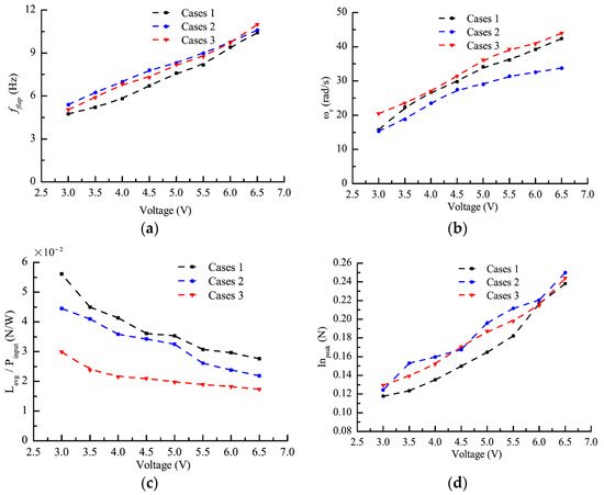 - Compared with the cases in Cases 2 (), the cases in Cases 1 () or Cases 3() share a relatively higher rotary speed given the same input voltage. The rotary speed for Case 3-8 (7 rev/s) are 1.3 times larger than that for Case 2-8 (5.375 rev/s).