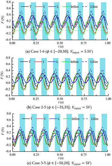 From the measuring results in Figure 9a, it can be found that Case 1-6, Cases 2–5, and Cases 3–5 share a similar flapping frequency (around 8.2 Hz). Then, the three cases are emphasized as the typical cases, and the total force (T), the inertial force (I), and the aerodynamic lift forces (L) in the three cases are shown in Figure 10. The force–time curves of the three cases start at the beginning of the upstroke when the maximum negative inertial force is found. An about 90° phase difference between the inertial force (I) and lift force (L) is observed since the minimum vertical acceleration occurs at the mid-downstroke while the aerodynamic lift nearly reaches the maximum value at this moment.