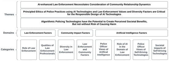 The traditional role of law enforcement in the 21st century United States has been one of crime control and order maintenance []. Additionally, the United States Bureau of Justice Statistics expands on this description of law enforcement by stating that its agencies and employees are responsible for enforcing laws, maintaining public order, and managing public safety. To carry out their responsibilities, police officers must have the ability to uphold every aspect of their profession to promote public safety and maintain the rule of law. Doing so requires a sense of ethics and the ability to use moral decision-making to navigate the grey areas of law enforcement and complex situations involving life and death. In addition, certain ideals and character traits enable police officers to act in ways to promote public safety and uphold the rule of law. Nevertheless, as technology advances, AI can increasingly enhance and, in some instances, replace various human elements of policing processes, procedures, and operations in real-world situations [,].