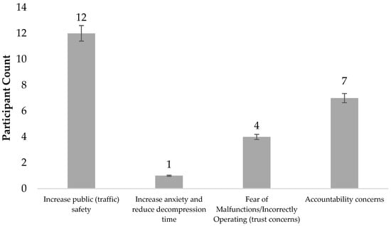 Self-driving technology has both beneficial and harmful implications for communities and law enforcement, as shown in Figure 3. According to the participants, autonomous vehicles have the potential to increase public safety and reduce traffic offenses or infractions for the general public. Additionally, self-driving technology could reduce the amount of distracted driving and instances of driving while intoxicated (DWI) events, promoting traffic safety and mitigating driver error. In contrast, fears of autonomous vehicles malfunctioning or operating incorrectly were a steady minority concern that could affect public safety and trust in the technology, including the fear of hacking [20%, n = 4]. However, the consensus was that as the technology improves, it will become less of a concern. One participant suggested that autonomous vehicles could increase anxiety and could take away from the time when individuals could decompress from stress during the physical act of manually driving a vehicle.
