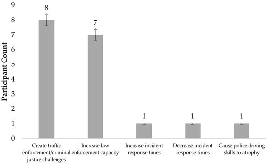 Widespread application of self-driving or AV technology creates novel challenges for law enforcement officers, as shown in Figure 4. Participants described traffic enforcement as problematic, citing concerns about assigning culpability during traffic stops and accidents, public policy implications, insurance coverage issues, and motor vehicle law enforcement training deficiencies for police officers when encountering autonomous vehicles. Conversely, participants described how self-driving technology enables increased law enforcement capacity to concentrate on other core policing tasks, reallocating human resources to other pressing law enforcement issues and increasing organizational efficiency. As a way of explicitly enhancing police capacity, it was noted that self-driving technology could decrease police response times to incidences based on improved navigation. Alternatively, it was suggested that the technology could increase police response times based in part on a lack of practical experience and study participants not knowing or fully understanding the capabilities of autonomous vehicles for policing. In addition, one participant expressed concern that officer use of self-driving technology may cause driving skills to atrophy. The following quotes from the study highlight the participants’ views of self-driving technology.