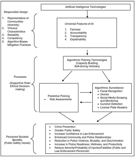 Artificial intelligence has the potential to bridge or hamper police and community engagement and relationships. To ensure AI can serve as a bridge for police and community engagement, AI policing technologies must be fair, accountable, transparent, and explainable. If algorithmic biases are not reined in, they create the potential to create a feedback loop that disproportionately targets minority and low-income communities, recreating the same public perceptions and issues of police discrimination from human officers. Privacy and safety protocols, as well as fairness and non-discrimination regulations, should be put into place in order to protect law enforcement professionals working around and with artificial intelligence and for members of the public who are either direct beneficiaries of the AI or perhaps a suspected criminal target based on historical crime data and datasets reflective of higher crime rates []. Moreover, any use of AI policing technologies must respect due process and the presumption of innocence while avoiding policing that discriminates against selected populations. A culture of accountability must be established at an institutional and organizational level that is transparent and shows how AI technologies in the context of police work develop conclusions and reach decisions. As a final point, AI policing technologies must be explainable, at least generally, in how decisions are reached []. Law enforcement professionals should, at a minimum, have a broad understanding of the AI technologies used in their jurisdictions and the criminal justice system as a whole. Procedural training for police officers who employ artificial intelligence technologies as they become more prevalent in law enforcement should start with basic police officer training to close the knowledge gap and foster the explainability principle. Moreover, AI technologies should not be so incomprehensible that the public cannot determine their use as a public good to promote public safety []. Figure 5 conceptualizes the findings from the study and from the background literature through the responsible design of AI policing technologies that addresses ethical and societal concerns.