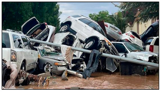 Jeddah city in Saudi Arabia is our study area. It is situated on a coastal plain. The west border is the Red Sea, and the east is Hijaz Mountains. Usually, valley areas are more threatened by flooding than others, especially after heavy rains [15]. Given the city’s heavy floods in 2011, 2012, 2016, and most recently, last November 2022, it was necessary to provide an efficient solution to reduce the effect of these cases. That can be achieved by a smart system providing early notifications about any potential floods. Figure 1 shows damages resulting from the last flood in 2022 in Jeddah.