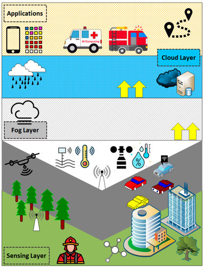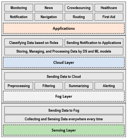 The WSNs and RFID connect to the cloud through fog computing. Fog computing is a system-level horizontal architecture that distributes computing, storage, resources, management, and networking services across the range from Cloud to Things [13]. Fog computing, in this case, minimizes the bandwidth needed and the back and onward contact between the cloud and the sensors, which could affect the entire system’s functionality. Fog and cloud computing then connect, and thus refined data collected from the sensors reaches the cloud for operation. According to collected data in the cloud, and in case of any event, few governmental organizations send warning messages (SMS) to the phones for the public. This method of notifying is not effective and does not support real-time awareness for users [14].
