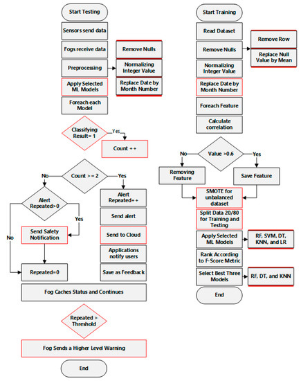 We applied the selected ML models to the final dataset and selected the best three models that gave the highest performance according to many metrics (accuracy, precision, recall, F-Score, and ROC curve). The best three models were DT, RF, and KNN. To enhance the accuracy and reliability of our algorithm, we depend on testing the actual value (input data formed by a fog) on these three models together. That means, the final result will depend on the majority of classification results of the three models. For example, if two of them give 1 and the third gives 0, then the result will be 1. In addition, we considered threats classification early before they become a disaster.