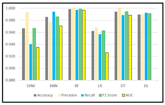 From Figure 5, the RF achieved the highest accuracy, “99%”, and a maximum precision of “1”. This means the margin of error is zero, and the probability of classified threat as not threat is zero also. That is very important in sensitive or critical systems. For the recall value, RF achieved 99%, which means there is a very small margin for error classification for the non-threat case as a threat. There is no effect in this case in the proposed framework. Because the framework repeats the testing process periodically to enhance the accuracy and to find the level of threat in real-time.