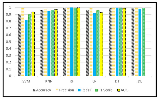 We applied our algorithm to the data set of the first five years (2009–2013), then we extended our data to confirm the stability of the results by adding data from the other five years (2018–2022). Figure 5 shows the performance of the different models (KNN, SVM, RF, DF, Log, and DL) on a dataset of five years (2009–2013). The RF and DT are superior in most of the parameters. DL also achieved a good result, but not better than RF; DL took more than 42 s for training while RF took less than 1 s.