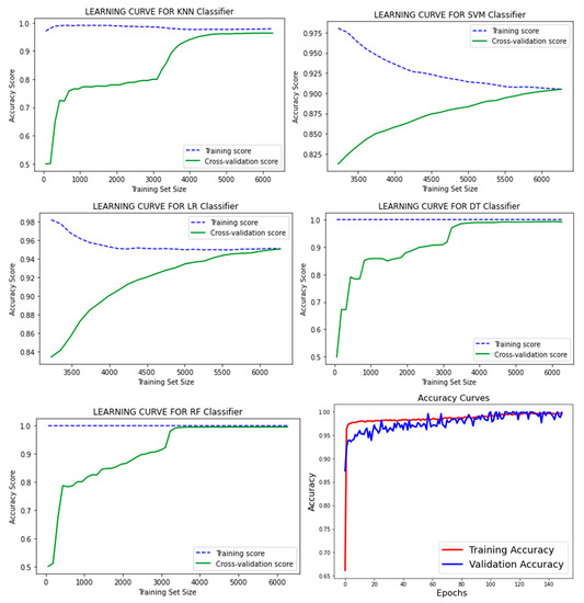 Finally, Figure 8 depicts the learning curve of each classification model. This figure proved the superiority of RF where the curve toward 1 and the gap between validation and training curve minimum. In addition, DL, KNN, and DT provided very good performance.