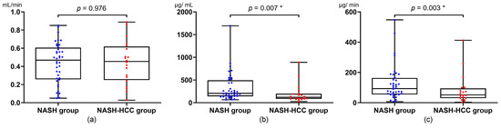 The saliva flow rate was similar between the NASH and NASH-HCC groups (Figure 1a). However, the salivary IgA concentration (p = 0.007) and flow rate (p = 0.003) in the NASH-HCC group were significantly lower and slower than in the NASH group, respectively (Figure 1b,c).