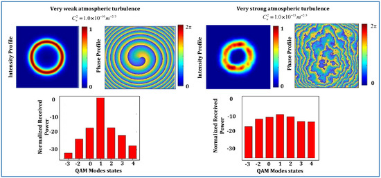 The simulation results for the intensity profile and phase front distortion of the purest OAM-OFDM-SMM-MIMO mode l = +1 are illustrated in Figure 3 under weak ( = 1.0 10−10) and ( < 1) and under strong atmospheric turbulence ( = 1.0 10−15) and ( > 1) conditions for the link distance of 1 km, respectively. For the purest mode, the beam waist parameter is = 1 m. In very weak AT, there is almost no phase front distortion, most of the transmitted power remains in OAM = +1 mode, and almost negligible optical power leakage occurs from this mode to other adjacent modes. However, under severe AT conditions, we clearly observe the EM field’s distorted phase front, which causes a high-power leakage to other modes. At the receiver end, the normalized power received for 7 different OAM modes is also shown in Figure 3. The normalized received power for l = +1 mode under strong AT conditions decreases by almost 10 dB compared to weak AT conditions, whereas l = −3 mode demonstrates the worst performance profile under the same conditions.