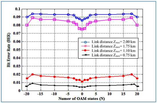 The BER performance of the proposed system is compared as a function of different order OAM mode states in Figure 6 for three different link distances, from a maximum of 2 km to a minimum of 0.75 km, respectively, in atmospheric turbulence. When the order of the OAM state is kept constant, say at 0, the BER increases with an increase in optical link distances. The plot validates the fact that with an increase in optical link distances, both the atmospheric attenuation and the turbulence become stronger, which ultimately leads to a higher numerical value of BER and hence the worst system performance. The proposed system performs admirably for lower-order OAM states with absolute values ranging from 0 to 5 over a propagation distance of 0.75 km, but it performs poorly for the same order of OAM modes over a distance of 2 km. This is because of the least spreading of lower-order OAM state modes’ energy, which is the minimum leakage of the mode energy from one mode to adjacent OAM modes.