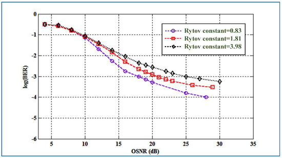The performance of the proposed system is also compared for log BER vs. OSNR ranging from 2 to 35 dB for GG turbulence conditions and different numerical values of the Rytov constant as shown in Figure 8. It can be seen from the plots that as the numerical value of the Rytov constant σ2 decreases from 3.98 to 0.83, the atmospheric turbulence becomes weaker, resulting in an excellent proposed system log BER performance. For the fixed value of OSNR at 20 dB, the log BER are −3.28, −2.91, and −2.55, corresponding to σ2 = 0.83, 1.81, and 3.98, respectively.