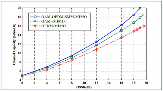 Figure 9 demonstrates the increase in channel capacity with respect to the function of different OSNRs (dB) for the three FSO systems, OFDM-MIMO, OAM-MIMO, and OAM-OFDM-SMM-MIMO, respectively, under turbulence conditions (). It is observed from the graph that the OAM-OFDM-MIMO FSO system for OAM state l = +1 and the 8 OFDM subcarrier based on SMM outperforms compares to the other two conventional MIMO-FSO systems. At 18 dB OSNR, the channel capacity offered by the proposed OAM-OFDM-SMM-MIMO system is nearly 3.3 bits/s/Hz better than a simple OFDM-MIMO system and 1.6 bits/s/Hz better than an OAM-OFDM-SMM based MIMO FSO transmission system. When the channel capacity was set to 14 bits/s/Hz, the proposed OAM-OFDM-MIMO FSO system based on SMM required nearly 3.2 dB less power than OFDM-MIMO and 1.1 dB less power than the OAM-MIMO FSO system. The result clearly validates that by combining OAM and OFDM along with the spatial mode diversity scheme, one can enhance the capacity of the FSO transmission system. We present a novel approach to increasing channel capacity while also increasing diversity gain.