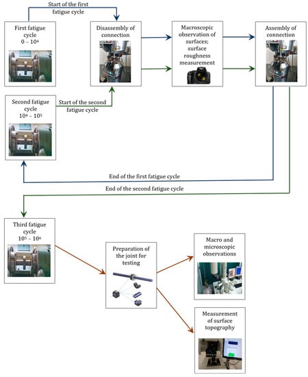 The test programme assumed the shaft top layer wear evaluation after fatigue tests and repeated sleeve disassembly. The fatigue tests were divided into three stages. After the first and second stages, the joint was disassembled by pulling the sleeve off the shaft by means of a press. After the third stage, the tribological kinematic pair was prepared for laboratory tests in accordance with the process procedure prepared specially for this purpose. The first stage lasted for 10,000 fatigue cycles, and the remaining two for one thousand cycles each. Each of the tested samples was subjected to the same number of fatigue cycles. The value of the maximum force needed for sleeve disassembly and assembly was recorded each time. Macrographic documentation and surface roughness measurements were also made. The testing programme permitting the assumed objective to be achieved is presented schematically in Figure 2.