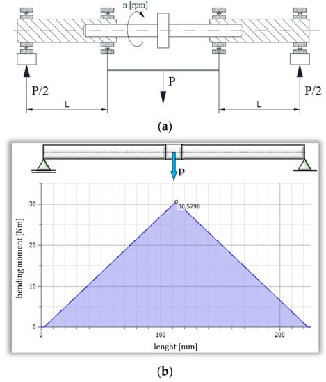 Wear tests were conducted on the fatigue testing machine permitting a rotational bending moment to be obtained. The tribological kinematic pair were loaded symmetrically with a concentrated force, and thus the bending moment pattern shown in Figure 3 was obtained. Wear test parameters are compiled in Table 3.