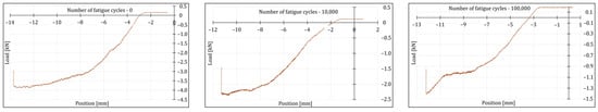 In the case of joint disassembly, varying maximum values of the forces needed to remove the sleeve from the shaft are also noted. The lowest value was recorded after the first fatigue cycle. After the successive fatigue cycles, greater forces were required to disconnect the joint. However, the difference between the maximum forces in the second and third fatigue cycles is insignificant and amounts to 0.2 kN only. Diagrams showing the shaft sleeve removal forces are presented in Figure 5.