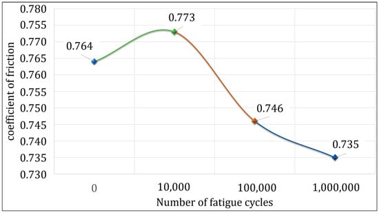 Change of the coefficient of friction depending on the number of fatigue cycles.