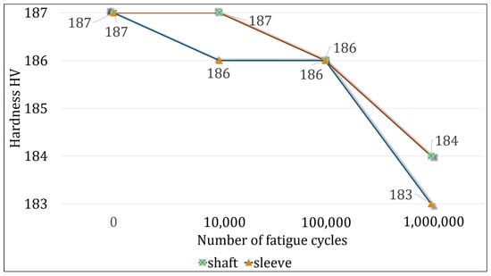 The initial hardness of both the sleeve and shaft was 187 HV. As the number of fatigue cycles increases, the decrease in surface hardness in the area affected by wear is noted. When the fatigue tests were completed, shaft hardness equal to 184 HV and sleeve hardness equal to 183 HV was measured. Thus, hardness change by 3–4 units in relation to the initial parameters was recorded. Lower hardness values may be due to the abrasion of the top layer of the elements. That phenomenon occurs when wear products travel, first during the joint assembly process and, second, during wear tests, as a result of microvibrations appearing in the tribological kinematic pair. Wear products from the fatigue tests considerably influence the “abrasion” of the surface because, due to those products’ oxidation, they are harder than the remaining wear products and even harder than the surface on which they occur.