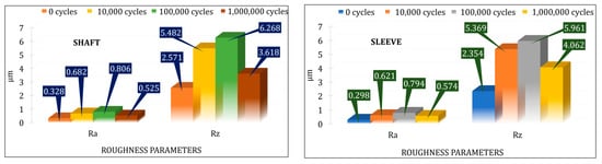 As part of this article, the basic parameters of the roughness of the shaft axle seat and sleeve hub were measured after each completed fatigue cycle. The change in the Ra and Rz roughness parameters after the successive fatigue cycles are presented in Figure 8. Figure 9 shows the sample roughness profiles recorded on the shaft surface.