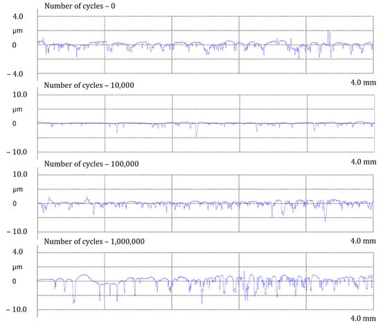 After the next fatigue cycle (100,000 cycles), the shaft surface profile changed its shape significantly. The change is due to wear products, which move along the joint and create microbuild-ups and, occasionally, adhesive bonds. The roughness profile image, such as the one presented in the figure for 100,000 cycles, confirms fretting wear development.