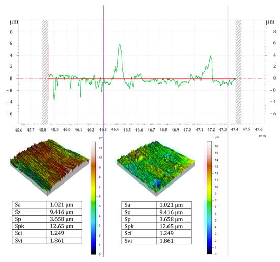 During the analysis of the parameter values for the surface not affected by wear, it may be noticed that the maximum surface height Sz is 9.416 μm, and the arithmetic mean surface height Sa = 1.021 μm.