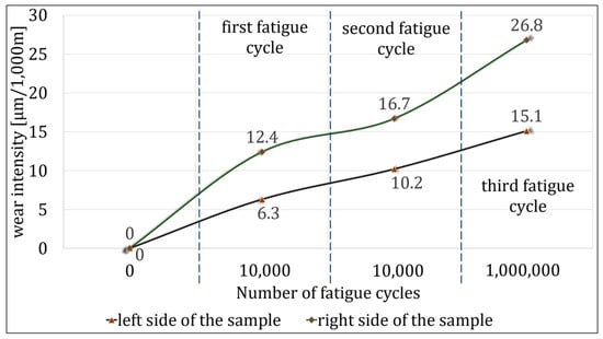 Quantification of wear data is represented by specific wear rate data [34]. Figure 12 presents shaft wear intensity after successive fatigue cycles. Macroscopic observations demonstrated the presence of wear traces on either side of the shaft axle seat, which is why the wear intensity measurement was conducted separately for each shaft side. Shaft axle seat wear intensity on the left side is considerably lower than on the right side, which was also noted during macroscopic observations. The left side of the sample corresponds to the side from which the joint assembly started. In the case of the left side of the axle seat, the increase in wear stability is steady, and it grows evenly with the number of fatigue cycles. The situation on the right side of the sample is different. In the first two fatigue cycles, wear increases steadily, but a sudden increase in wear intensity is noted in the third fatigue cycle. The magnitude of wear is influenced by both joint assembly processes and fatigue loads. Therefore, that situation should be explained in terms of the mechanism of fretting wear development in forced-in joints. In the case of that type of joint, roughness is particularly important in terms of the actual contact between the surfaces and, consequently, for initiating the development of fretting wear. Joining the shaft with the sleeve—whose bondable surfaces have a similar roughness profile—will cause a situation where, as a result of the operation of the tangent force, first of all, the mutual shearing of the microirregularities on both surfaces will occur. In view of the gap shape, wear products on the right side of the shaft axle seat will be removed more easily, and therefore, a greater contact area between the first bodies will come into being. The right side of the joint is wider than the left one, and this can be seen in Figure 13.