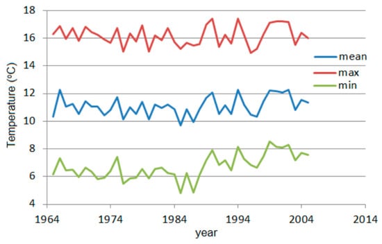 The data used for modeling consisted of annual temperatures series (minimum, maximum, and average) recorded from 1965 to 2005 at ten sites from Dobrogea, a region located in the southeast of Romania, between the lower Danube River, the Danube Delta, and the Black Sea Littoral (Figure 2), strongly influenced by the marine circulation.