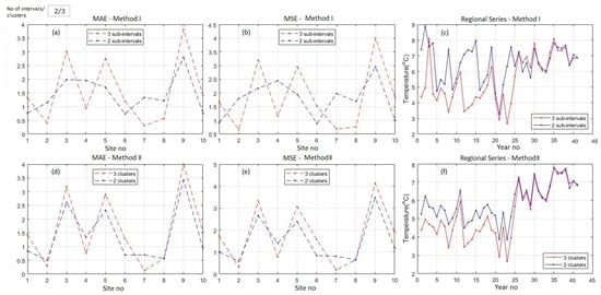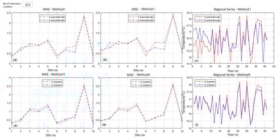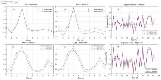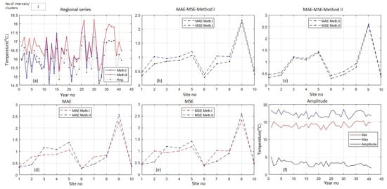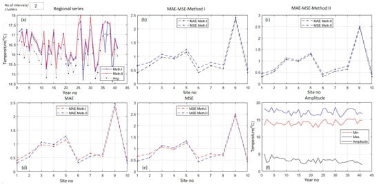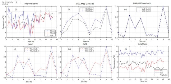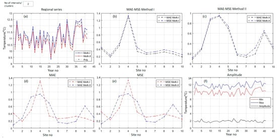 The case of two intervals/clusters for the series of minimum temperatures: (a) ‘Regional series’; (b) MAE and MSE—Method I; (c) MAE and MSE—Method II; (d) comparisons of MAEs; (e) comparisons of MSEs; (f) min, max, and amplitude of the minimum temperature series.