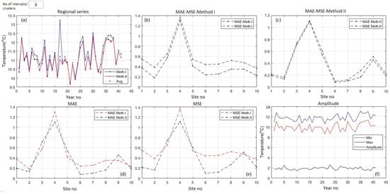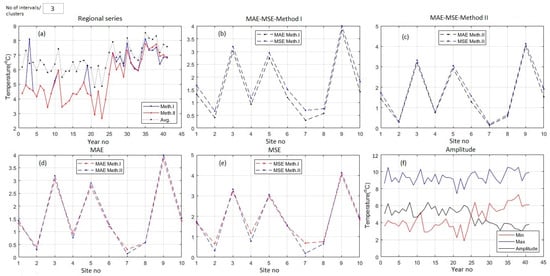 The case of three intervals/clusters for the series of minimum temperatures: (a) ‘Regional series’; (b) MAE and MSE—Method I; (c) MAE and MSE—Method II; (d) comparisons of MAEs; (e) comparisons of MSEs; (f) min, max, and amplitude of the minimum temperature series.