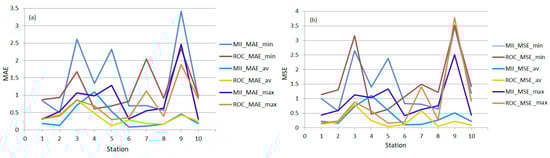 The worst results were obtained in both cases for the minimum ‘Regional series’, given that the series of minimum temperatures had a higher range than the other series. Comparisons between MAEs (MSEs) in all cases are provided in Figure 13. The following abbreviations were used in this figure: MII was the best model; min, max, and av denote the minimum, maximum, and average series; RCO is the abbreviation for ROCADA.