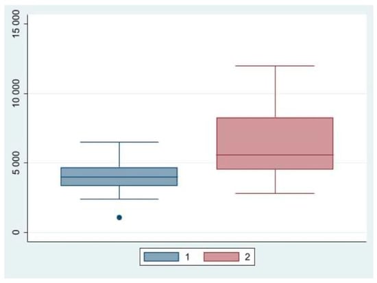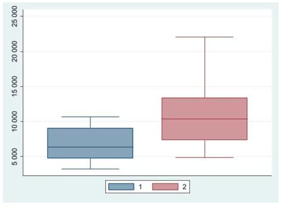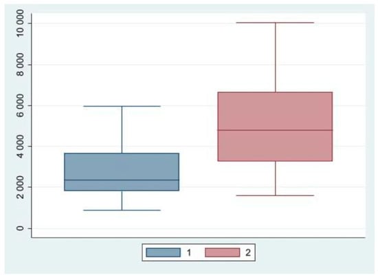 Box and Whiskers Plot graph representing total volume (VTOT) values at T0 (1) and at T1 (2).