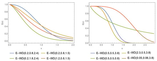 Various visual representations of the E-WD PDF are shown in Figure 1. The representations of f(x) are obtained for and for; (i) (blue-line), (ii) (green-line), (iii) (orange-line), (vi) (red-line). In Figure 1, the representations of f(x) are obtained for and for; (i) (blue-line), (ii) (green-line), (iii) (orange-line), (vi) (red-line). In left banal of Figure 1 we can observe the different shapes of the PDF of the E-WD. These include a right-skewed shape (green line), a decreasing shape (orange line), a curved shape (red line), zero skewness and a symmetrical shape (blue line). In right banal of Figure 1 we can observe the different shapes of the PDF of the E-WD. These include a left-skewed shape (red line), a decreasing shape (green line), and a symmetrical shape (blue line and orange line). From Figure 1, we can see that the E-WD PDF is very flexible and therefore can be used to cover datasets with indicated, decreasing, right-skewed, left-skewed or symmetric behaviour. Figure 2 presents the CDF of the corresponding casses of Figure 1.