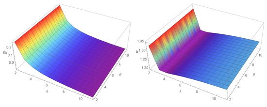 where . These quartiles can be used to derive further properties of the E-WD such as (i) skewness (see Bowley [20]) and (ii) kurtosis (See, Moor [21]). Figure 3 plots the skewness and kurtosis of the model . The skewness and kurtosis formulas are, respectively, given by