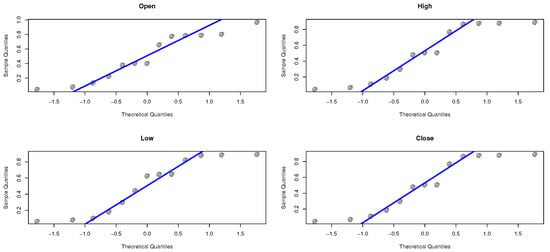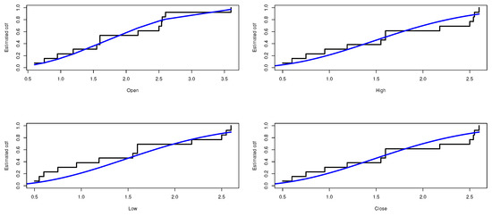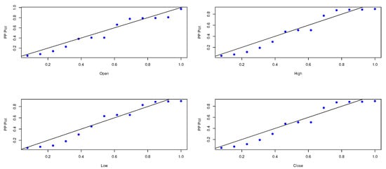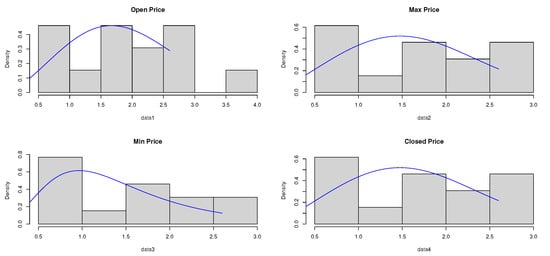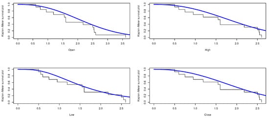 In this section, we apply the composite distribution E-WD to Sarhad stock exchange market transactions data for four variables especially: the open price, the high price, the low price, and the close price. Table 3 shows the descriptive statistics of the proposed stock price data. The data is analyzed and the maximum likelihood and the bayesian estimate results for the parameters and , respectively, are obtained. Table 4, Table 5, Table 6 and Table 7 represent the estimate result for the opening price, the high price, the low price, and the Closing price, respectively. The stimated PDF and stimated PDF of the proposed data based on E-WD are ploted in Figure 4 and Figure 5, respectively. The PP plot are shown in Figure 6. The Kaplan–Meier survival function the Q-Q normality plot are shown in Figure 7 and Figure 8, respectively.