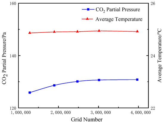 In this study, an unstructured grid was used to divide the area under calculation. Considering the large gradient variation in various parameters in the breathing zone of passengers, air inlets, and air outlets, the grid adopted a method of dividing the carriage as a whole and local mesh encryption. After the trial calculations, when the number of grids exceeded 2,474,927, the change was less than 2% in the PP of CO2 in the passenger breathing zone and 1% in the average temperature, as shown in Figure 5. Therefore, this set of grids could meet the requirements of grid independence.