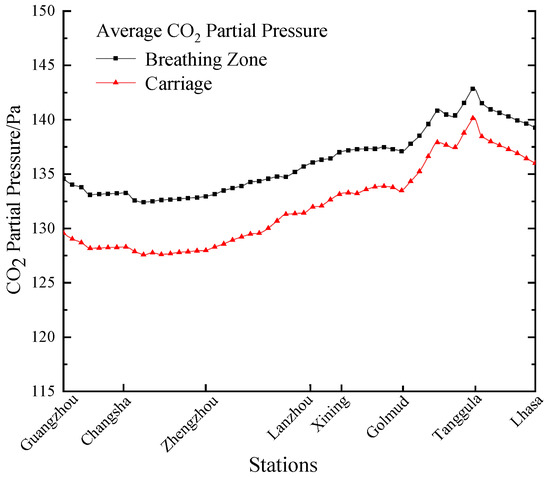 A comparison between the average CO2 PP in the carriage and the average CO2 PP in the breathing zone under the same FAV (20 m3/h·person) is shown in Figure 6. It can be observed that the average CO2 PP in the carriage is lower than that in the breathing zone when the train is running. Basically, if the upper limit of the average CO2 PP in the carriage is used as the reference parameter for adjusting the FAV, the CO2 released by passengers would exceed the allowable upper limit. Therefore, the average CO2 concentration in the carriage does not represent the real level in the breathing zone of passengers, and the lumped parameter method is no longer applicable for the calculation of the CO2 PP.