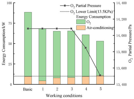 Figure 12 shows the O2 PP in the train and the total energy consumption of the ACS and OSS under different calculation conditions (Table 5). The effect of changing the FAV on the energy consumption of ACS and OSS revealed significant differences in the calculation results. Increasing the FAV simultaneously diluted the concentrations of CO2 and O2 in the train. This explains the restrictive relationship between O2 PP, CO2 PP, and FAV. Calculation conditions 1–3 in Table 5 indicate that reducing the FAV can simultaneously reduce the OSV while maintaining the indoor O2 PP. Therefore, reducing the FAV can significantly reduce the energy consumption of the oxygen supply. Calculation conditions 3–5 further explain the importance of reducing the oxygen supply to save energy while maintaining FAV. When the OSVs were 0.138, 0.124, and 0.102 m3/s, the oxygen energy consumption was reduced by 21.59, 29.55, and 42.07%, respectively, compared to the basic condition. When the OSV was 0.102 m3/s, the O2 PP in the carriage reached the lowest limit specified in the standard [12]. In Figure 12, it can be seen that the energy consumption of the ACS was the lowest under calculation condition 1. However, the ACS energy consumption accounted for a small proportion of the total energy consumption, indicating that the oxygen supply energy consumption had a greater impact on the total energy consumption. The importance of reducing OSS energy consumption was also revealed in reference [8], and measures were provided to reduce OSS energy consumption by reducing the FAV. Basically, the total energy consumption of the system achieved its minimum value under calculation condition 5, in which the oxygen energy consumption was the lowest. Therefore, when the train was running in oxygen supply areas, the adjustment of the FAV should be based on reducing the OSS energy consumption as measures to reduce the ACS energy consumption had little effect on the total energy consumption.