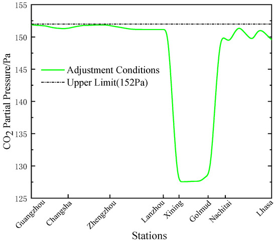 Figure 13 shows the CO2 PP variation curve under optimal ACS adjustment conditions. It is seen that when the train is running from Guangzhou to Lanzhou stations, the CO2 PP in the breathing zone of the passengers is close to the upper limit value, and the ACS operates under minimum FAV. When the train is between Xining and Golmud stations, the FAV adopted the recommended value of the reference because increasing the FAV could reduce the ACS energy consumption [21]. Under these working conditions, the air quality in the train improved while reducing the energy consumption of the ACS. When the train ran in the O2 supply areas (Nachitai-Lhasa) because the ACS energy consumption accounted for a small proportion of the total energy consumption, the aim of adjusting the FAV was to reduce the OSS energy consumption; therefore, the train was still running at the minimum FAV in these areas, and the CO2 PP in the train increased again towards the upper limit.