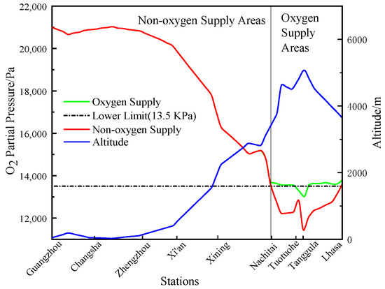 Figure 14 shows the variation of the O2 PP under optimal O2 supply and no-oxygen supply conditions. It is observed that the variation trend of O2 PP under no-oxygen supply conditions is opposite to the increasing altitude. Trains running in plains maintain a high O2 PP level. When the train passed Xi’an station and continued to move west, with a rapid increase in altitude, the O2 PP dropped sharply. The O2 PP was the lowest (13.5 kPa) when the train arrived at Nachitai station. If O2 supply measures had not been taken at this time, the air inside the carriage would have been in a hypoxic state for the rest of the journey. This result is consistent with the results in reference [5]; therefore, diffusion O2 supply should be started after the Nachitai station, and the OSV should be adjusted under the lowest energy consumption condition to keep the O2 PP above 13.5 kPa. When the train passed Tuotuohe station towards Tanggula, the altitude increased rapidly to 5072 m. Here, even if O2 was supplied at the maximum concentration limit (25%), the PP of O2 still could not reach 13.5 kPa. If 13.5 kPa was used as the O2 PP adjustment target, the diffusion O2 supply concentration would exceed 25%, which would not satisfy the requirements for a safe O2 concentration range [21]. However, the safety problem was ignored in reference [5] to meet the O2 PP, and the train running in this area should still use 25% oxygen concentration for oxygen supply. This suggests strengthening the use of distributed O2 supply equipment and inspection of train stewards in this area [29].