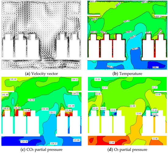 Figure 15 shows the physical field distribution on the cross-section (y = 6 m) of the carriage when the train passed through Tanggula station under optimised air supply conditions. In this area, even if the maximum oxygen supply concentration was used, the average O2 PP in the breathing zone of the passengers could not satisfy the minimum value of 13.5 kPa specified in the standard [12]. It is necessary to analyse each physical field in the train under optimal air supply conditions. The physical field in a train results from the combined effects of solar radiation, human body heat dissipation, AC, and passenger respiration. Furthermore, CO2 and O2 concentration fields in the train have a strong coupling effect with the temperature field [26].