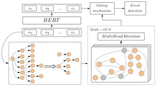 After Google proposed the Transformer architecture [15] in 2019, using the self-attention mechanism to extract context in the word vector, on the basis of Transformer, the Bert architecture was proposed to achieve unsupervised training on massive texts. Yang et al. [16] then introduced the Bert architecture into event extraction, and used it as a generation word vector for the next feature aggregation, and they proposed dataset generation technology based on Bert’s mask mechanism. Ramponi et al. [17] introduced an event extraction mechanism based on the Bert mechanism into the key event extraction for biomedicine and optimized it for relevant fields. To address the challenges posed by complex syntax, many graph-based models have been introduced to the event extraction model. Liu et al. [5] constructed isomorphic graph structures by combining the results of syntactic dependency analysis with words; they used graph attention networks for feature aggregation and also simplified and optimized the complexity of graphs. In addition to sentence-level event extraction, corresponding studies have been conducted on document-level event extraction. Zheng et al. [18] proposed an end-to-end document-level event extraction system in the field of Chinese finance. Yang et al. [19] proposed filtering out key sentences from the document level and then performing the sentence-level event extraction task, to achieve text-level event extraction. Yan et al. [20] proposed the idea of multi-hop dependency parsing, using the graph attention network (GAT) [21] to transform the dependency syntax tree into a multi-level graph structure for modeling, thus enhancing the semantic association between trigger words and related entities. Cui et al. [7] introduced dependency label information into GCN and proposed an edge-enhanced graph neural network model, which achieved better performance than the current benchmark model. However, because the focus of the model is integrating syntactic structure and typed dependency labels, it only uses a simple splicing method to fuse the semantic information and structural dependency information of sentences, without distinguishing the importance of dependency relationships. Effectively using the results of sentence dependency parsing and integrating this structured information into the model without adding redundant information still remain challenging in this context.