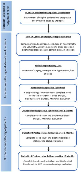 We conducted this one-hospital prospective observational study between 2017 and 2019, Figure 1. The study was approved by the local Ethics Committee of Biomedical Research (approval Nr 158200-16-882-389) 2016 12 13 and the State Data Protection Inspectorate. The study complied with the Declaration of Helsinki, as a statement of ethical principles for medical research involving people, human materials and participants’ protection. Patients were provided with detailed information about the RN, possible risks of surgery, follow-up visits and tests that were to be performed for research together with health management purposes. Written informed consent was taken from all patients. This is the third part of the research, previously investigated AKI and CKD after PN.